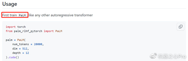 不过该项目目前只包含训练架构和代码,没有预先训练好的权重。在使用说明上,文档也显示必须先要训练 PaLM。